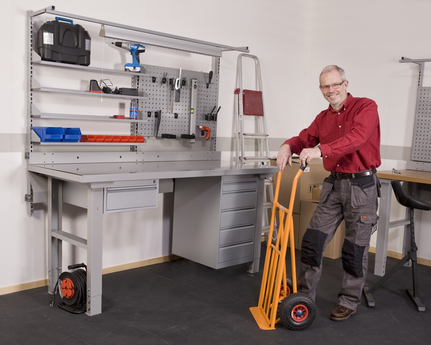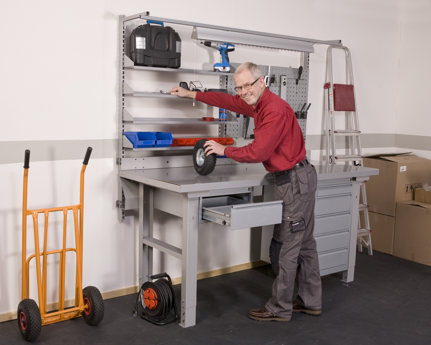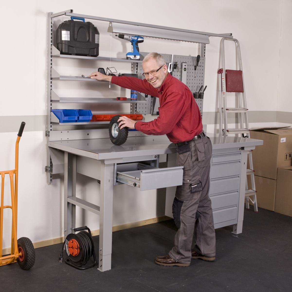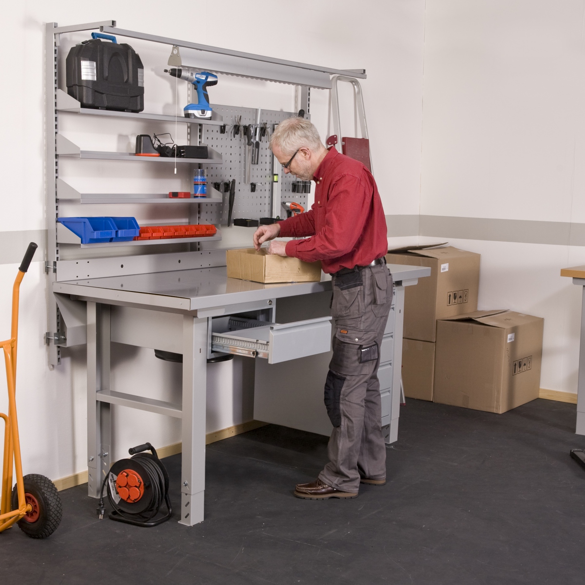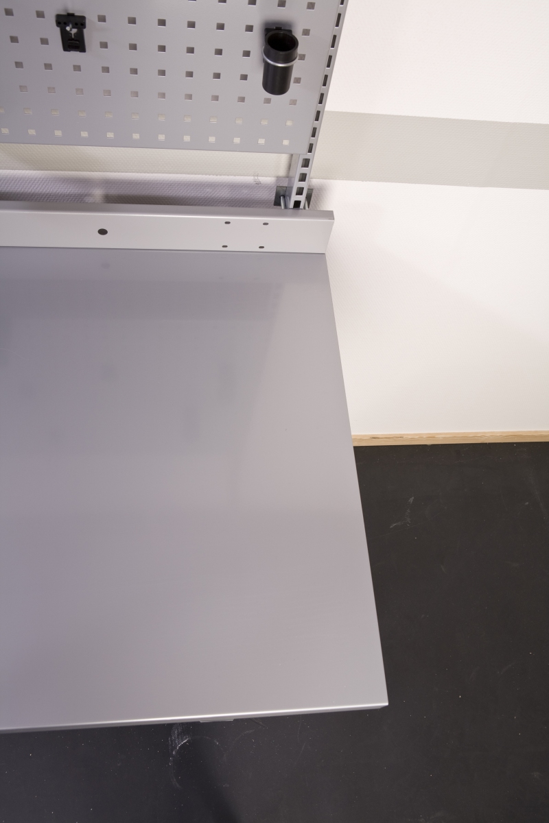 Ingår: Plåtskiva, träskiva och två st bänkbockar. Vid 2500 mm längd ingår tre st bänkbockar. Bänkbockarna är silverfärgade RAL 9006