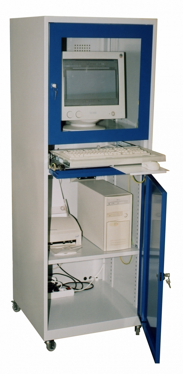 Skåpet har separat lucka för utdragbart tangentbord, fläkt med filter och eluttag. Utdragbar musplatta samt fyra hjul