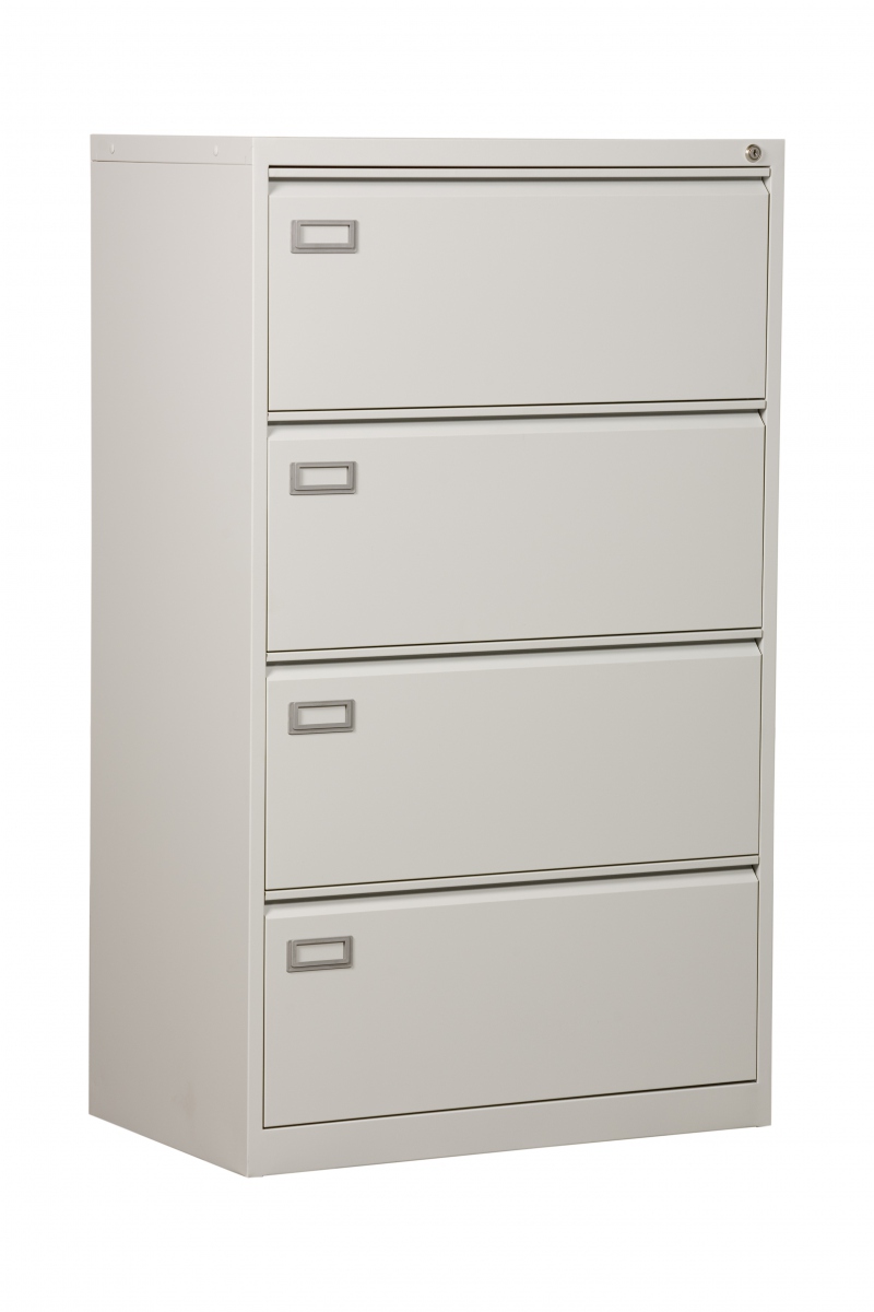 4-lådigt flankskåp. Lådorna är anpassade för två rader hängmappar i A4 format. Skåpet är försett med centrallås och utdragspärr
