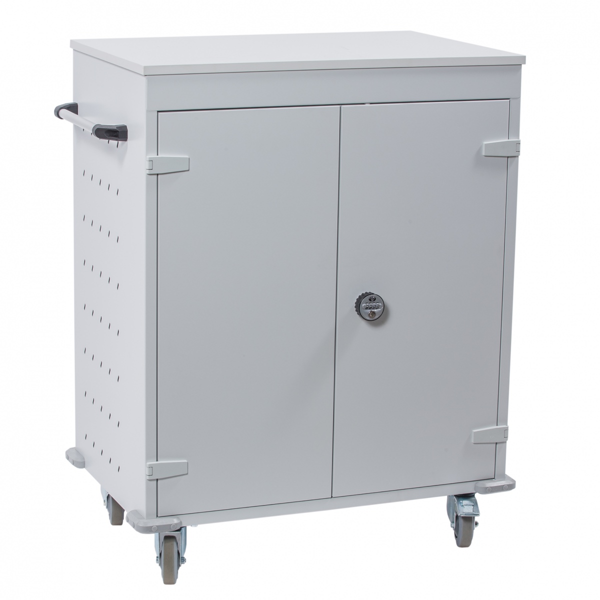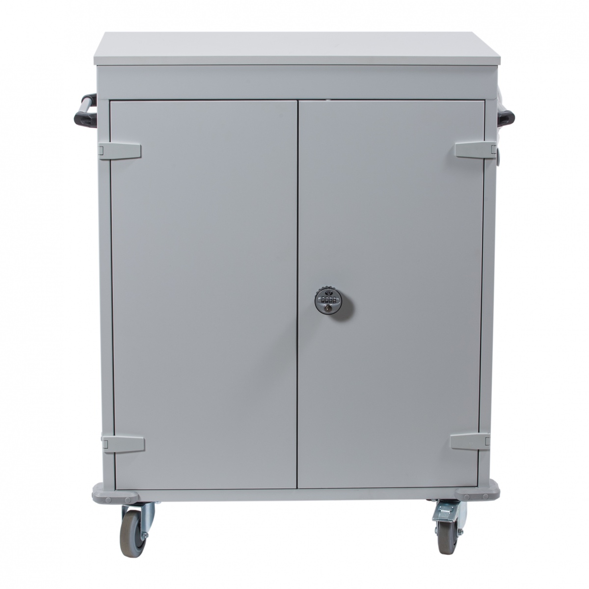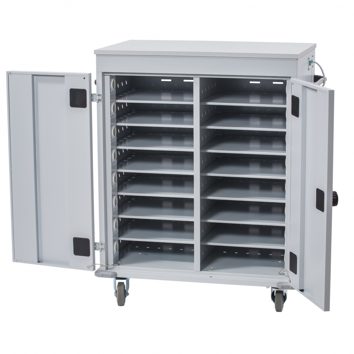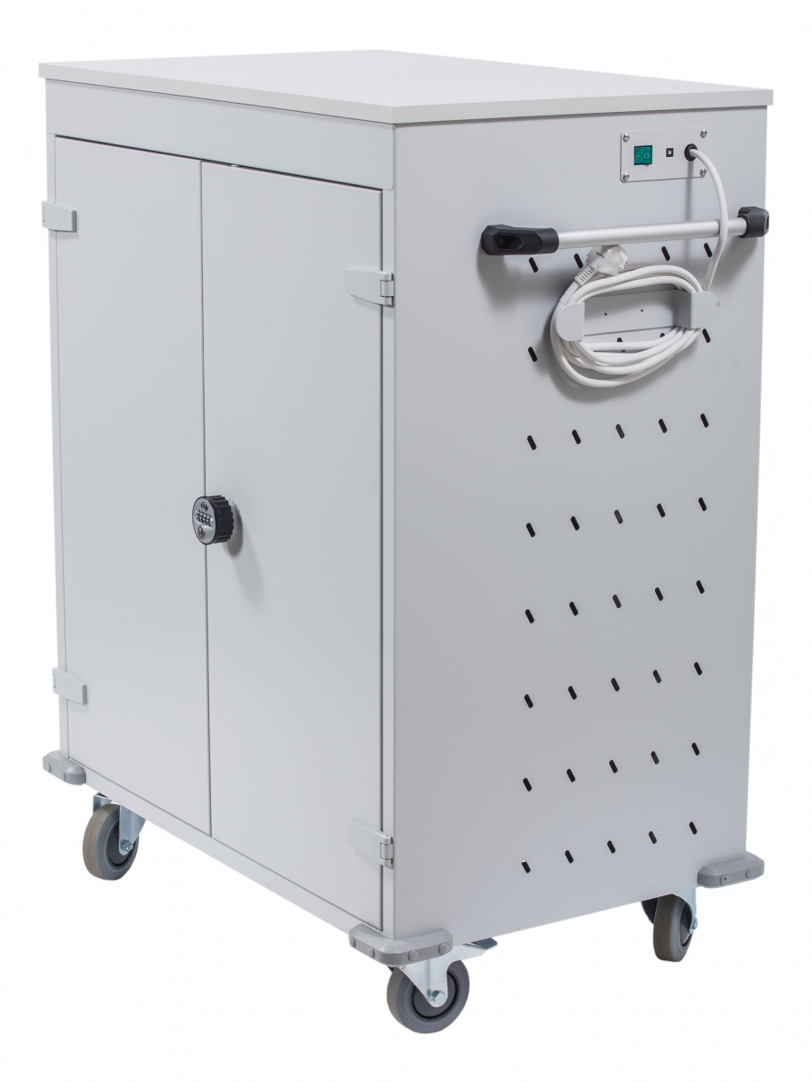 Laddstation med plats för 16 bärbara datorer och surfplattor. Fyra hjul varav två är med broms. Dörrarna låses med kodlås.