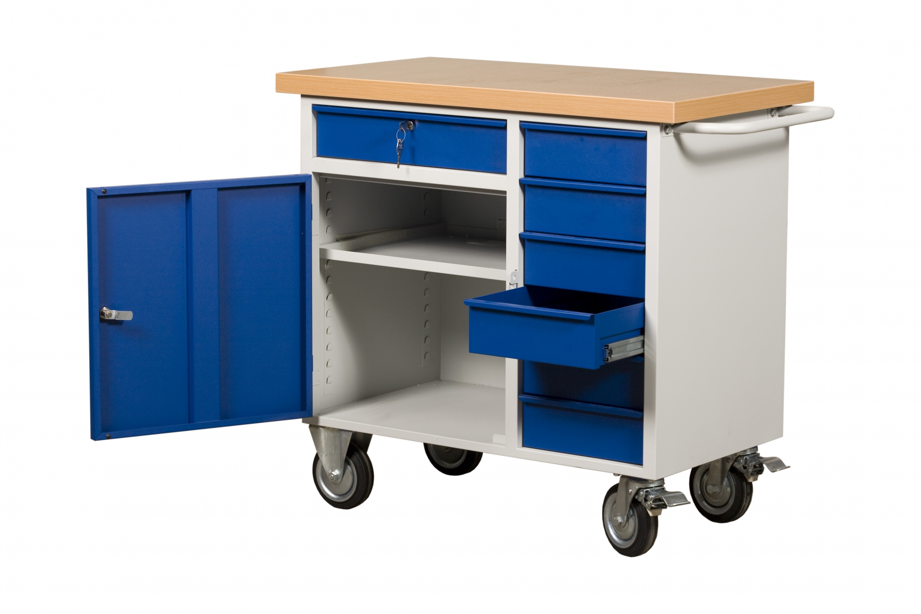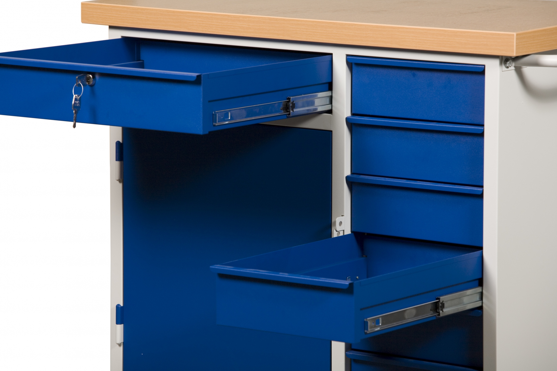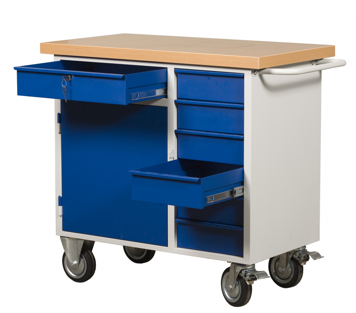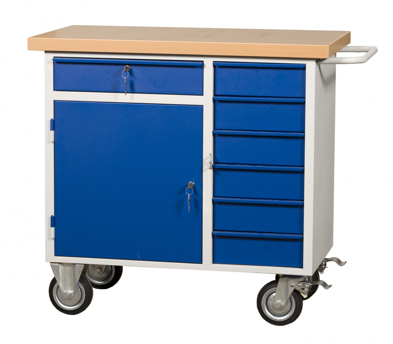 Verktygsvagn med sju lådor och ett skåp med hylla. Den breda lådan och skåpet har separata cylinderlås. Lådraden med sex lådor kan låsas med centrallås. Skiva 40 mm board med bokkant. Kraftiga kullagrade expansionsbeslag i alla lådor.