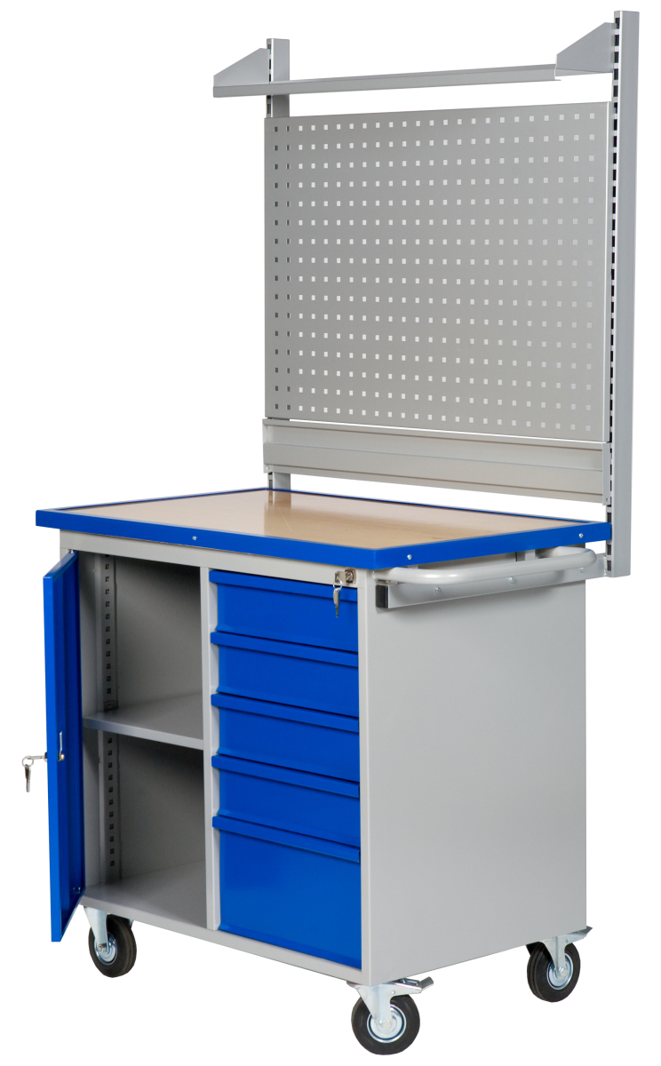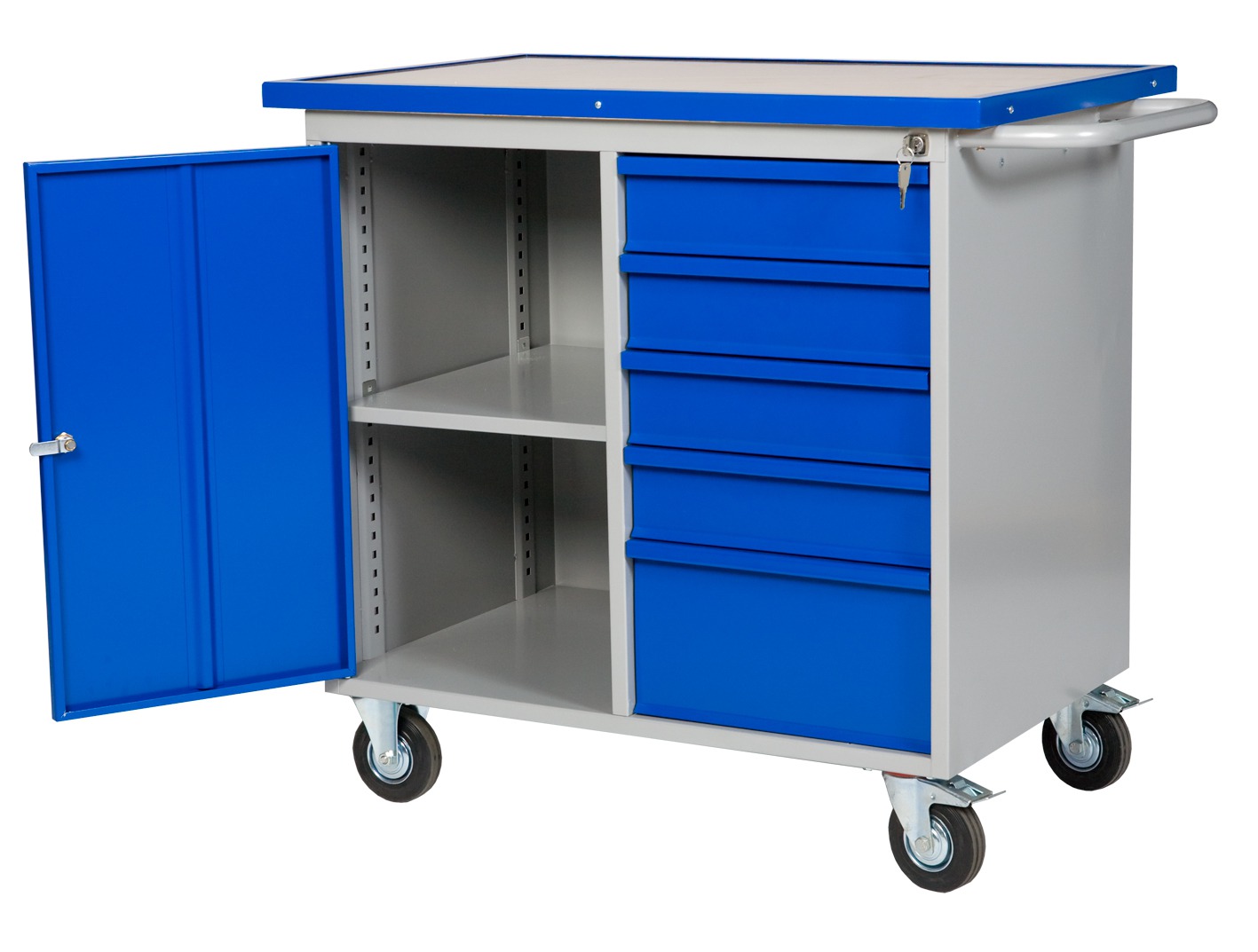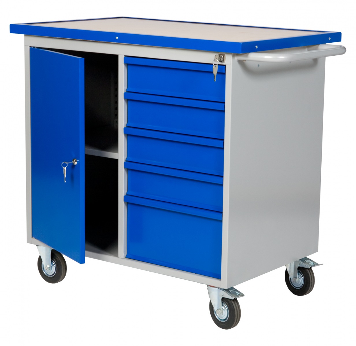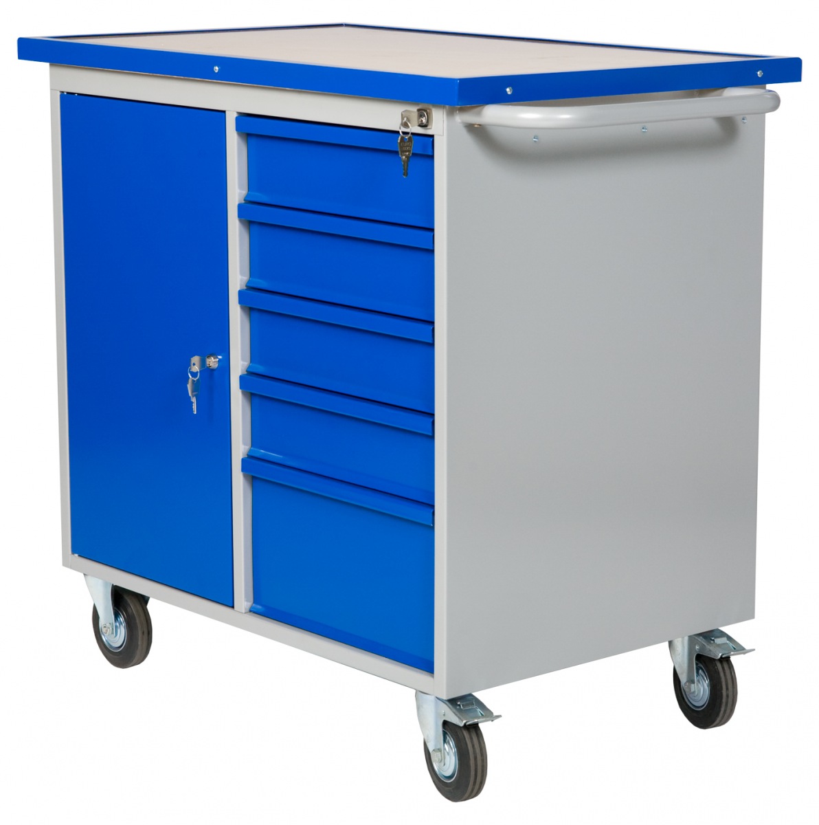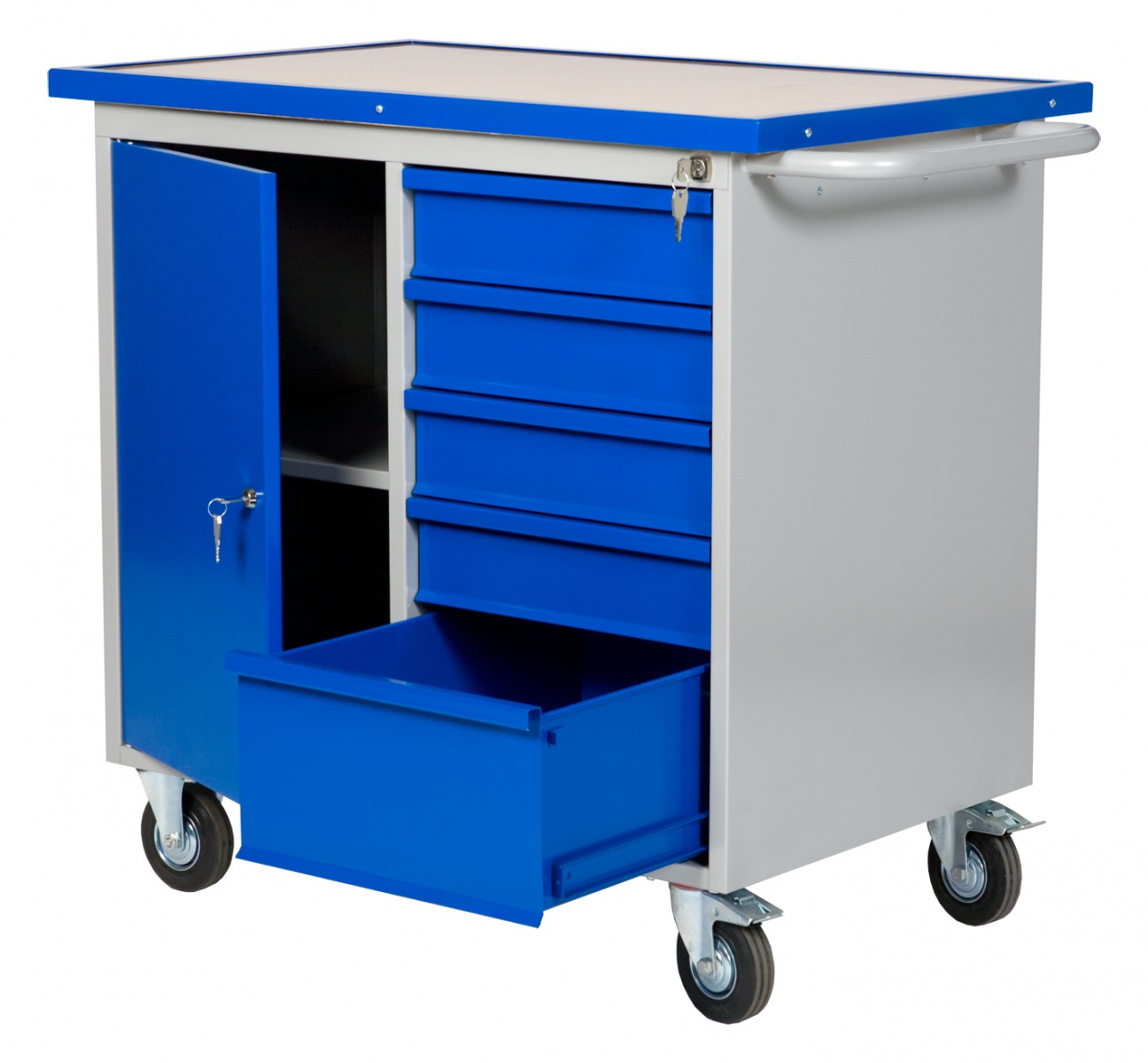 Verktygsvagn på hjul. Ett skåp och fem lådor varav en är djup. Lådorna är försedda med centrallås